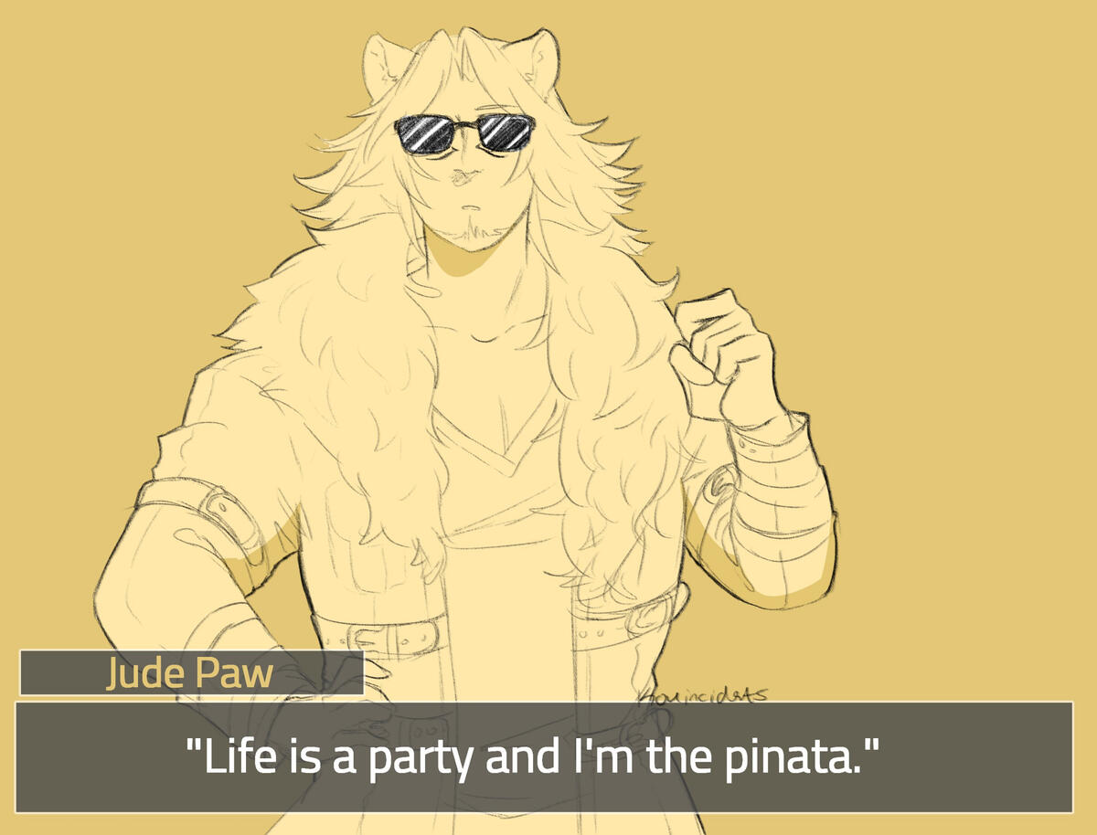 Above all else, Jude is an adrenaline junkie. Whether it's the rush of a friendly sparring match, an intense game of blitzball, or a fight for his very life, he cherishes the feeling of physicality, and is always seeking his next challenge.Outside of this, Jude is a lover of stories of all kinds; he loves to listen to the tales of other adventurers’ past glories, and enjoys books very nearly as much, provided the words are not too challenging for him. He has particular affection for stories involving knights, heroes, princesses and monsters.Jude is also quite enamored with sweet food and drink, and enjoys honeyed Gridanian walnuts and ice cold, sweet Ala Mhigan red wine in particular. His ever-growing hunger for treats has lead to him becoming something of an unorthodox (but eternally determined) chef, experimenting with strange food combinations in search of uniquely satisfying sweet flavor.