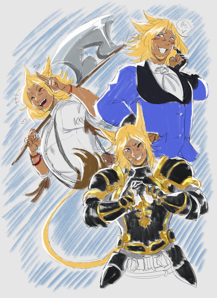 HAIR: The color of spun gold and worn long, in the fashion of the storybook knights he admires and wishes to emulate.EYES: Blue as bright as the clear sky.BUILD: Short by miqo’te standards, thickset and stocky, Jude is powerfully built in a way that isn’t quite proportional with his diminutive frame, to the point that he sometimes has difficulty finding equipment that fits him properly.Hobbies: